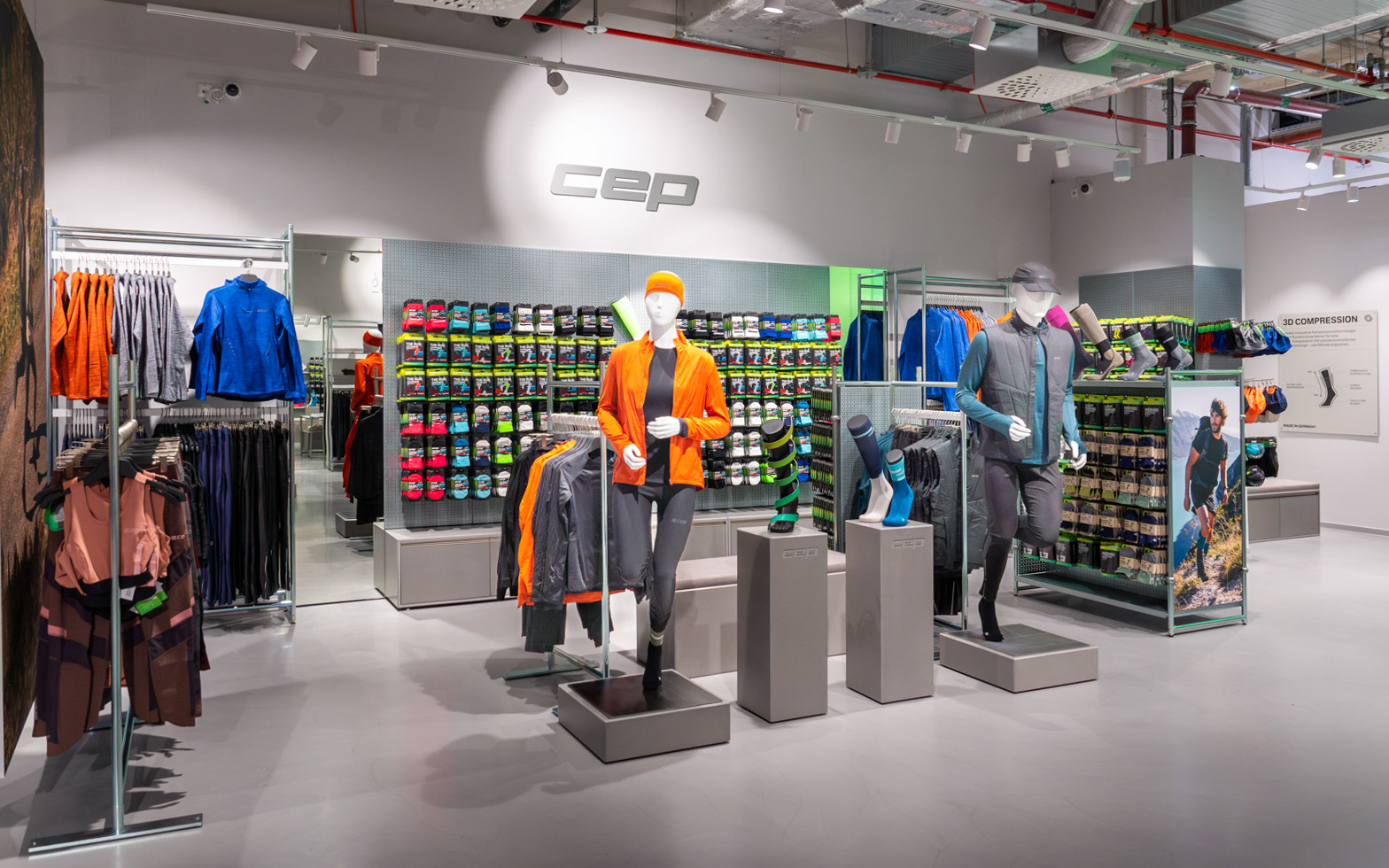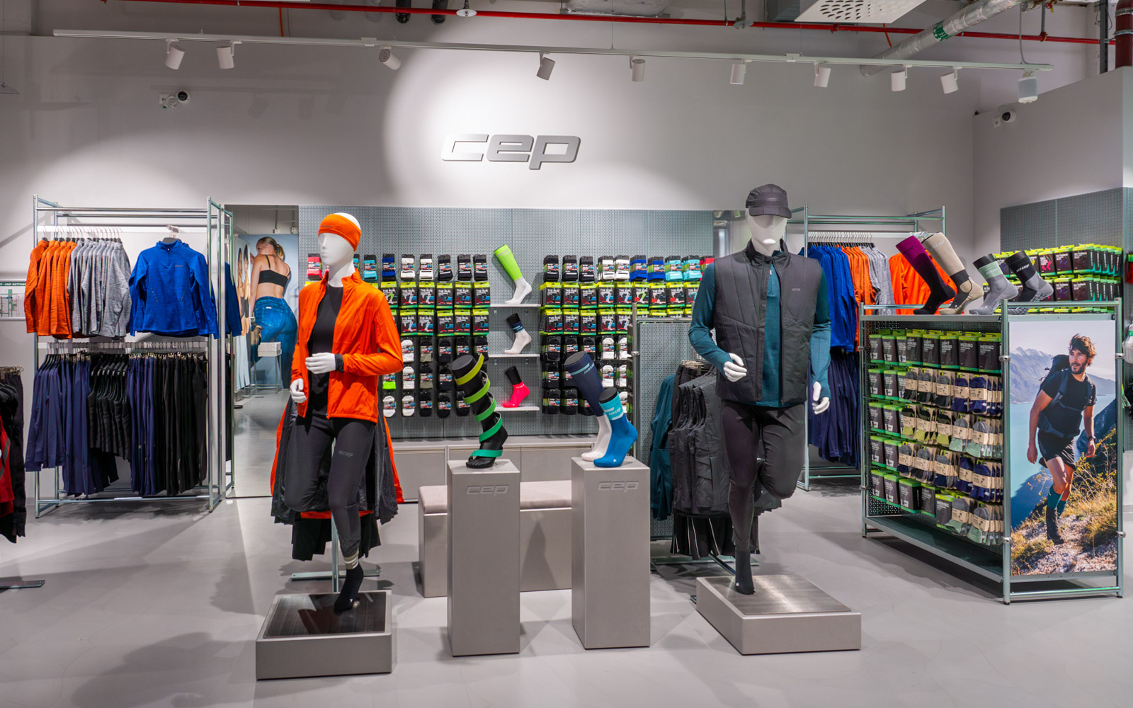 CEP, dedicated to athletes aiming to enhance their performance, showcases its high-quality compression gear—including running socks, sleeves, and apparel—through wall-mounted shelves, crossbars, and freestanding racks, ensuring optimal visibility and accessibility.